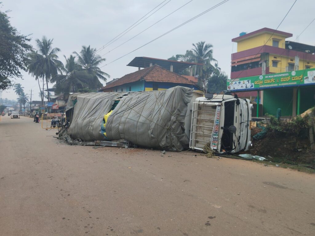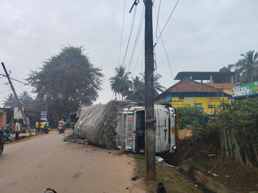 ಹೊಸನಗರ:ಪಟ್ಟಣದ ಶಿವಮೊಗ್ಗ ರಸ್ತೆಯ ಗುರುಶಕ್ತಿ ಆಟೋಮೊಬೈಲ್ಸ್ ಬಳಿ ಮುಂಜಾನೆ ಮಂಗಳೂರಿನಿಂದ ಸೊರಬಕ್ಕೆ ಗೊಬ್ಬರ ತುಂಬಿಕೊಂಡು ತೆರಳುತ್ತಿದ್ದ ಕ್ಯಾಂಟರ್ ಲಾರಿ ಚಾಲಕನ ನಿಯಂತ್ರಣ ತಪ್ಪಿ ಪಲ್ಟಿಯಾಗಿದ್ದು ಎರಡು ವಿದ್ಯುತ್ ಕಂಬಗಳಿಗೆ ಸಂಪೂರ್ಣ ಹಾನಿಯಾಗಿದ್ದು ಅದೃಷ್ಟವಶ ಯಾವುದೇ ಪ್ರಾಣ ಹಾನಿ ಸಂಭವಿಸಿಲ್ಲ.