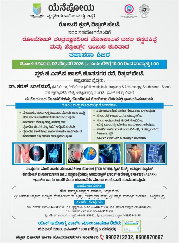ಬಟ್ಟೆಮಲ್ಲಪ್ಪ : ರಿಪ್ಪನ್ ಪೇಟೆ ಜಿ. ಎಸ್. ಬಿ. ಹಾಲ್ ನಲ್ಲಿ ಇದೇ ಫೆ. 7ರಂದು ರೋಬೋಟ್ ತಂತ್ರಜ್ಞಾನದಿಂದ ಮೊಣಕಾಲು, ಸೊಂಟ ನೋವಿಗೆ ಬದಲಿ ಶಸ್ತ್ರ ಚಿಕಿತ್ಸೆ ಮತ್ತು ಸ್ಪೋರ್ಟ್ಸ್ ಇಂಜುರಿ ಕುರಿತಾದ ಬೃಹತ್ ತಪಾಸಣ ಶಿಬಿರವನ್ನು ಪ್ರತಿಷ್ಠಿತ ಮಂಗಳೂರು ಯೆನೆಪೋಯ ವೈದ್ಯಕೀಯ ಕಾಲೇಜು ಆಸ್ಪತ್ರೆಯ ನುರಿತ ವೈದ್ಯರಿಂದ ಹಮ್ಮಿಕೊಳ್ಳಲಾಗಿದೆ.