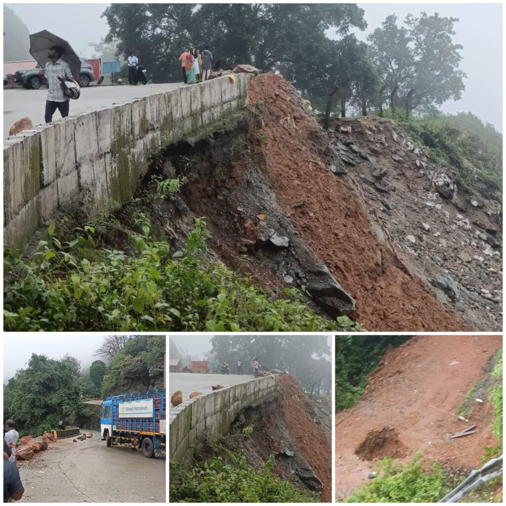 ಹುಲಿಕಲ್ ಘಾಟ್ ಮಾರ್ಗದ ಚಂಡಿಕಾಂಬ ದೇವಸ್ಥಾನದ ಕೆಳಭಾಗದಲ್ಲಿ ಬರುವ ಹೇರ್ ಪಿನ್ ತಿರುವಿನಲ್ಲಿ ಬಾರೀ ಪ್ರಮಾಣದಲ್ಲಿ ಮಣ್ಣು ಕುಸಿತ ಕಂಡು ಬಂದಿದೆ. ಈ ಹಿಂದೆ ತಡೆಗೋಡೆ ಕಾಮಗಾರಿ ನಡೆದಿದೆಯಾದರೂ.. ಕಳೆದ ಒಂದು ವಾರದಿಂದ ಸುರಿಯುತ್ತಿರುವ ಮಳೆಗೆ ತಡೆಗೋಡೆಗೆ ಹಾಕಿದ ಮಣ್ಣು ಸೇರಿದಂತೆ ಕೆಳಭಾಗದವರೆಗೂ ಮಣ್ಣು ಕುಸಿದಿದ್ದು ಭಯದ ವಾತಾವರಣ ಸೃ಼ಷ್ಟಿಸಿದೆ.