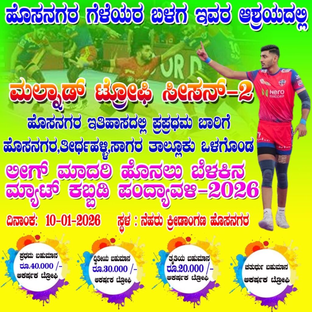 ಹೊಸನಗರ, ಸಾಗರ, ತೀರ್ಥಹಳ್ಳಿ ಯ ಆಯ್ದ ಕ್ರೀಡಾಪಟುಗಳು ಲೀಗ್ ಮಾದರಿಯ ಹೊನಲು ಬೆಳಕಿನ ಮ್ಯಾಟ್ ಕಬ್ಬಡಿ ಪಂದ್ಯಾವಳಿಯನ್ನು ಆಯೋಜಿಸಲಾಗಿದೆ.