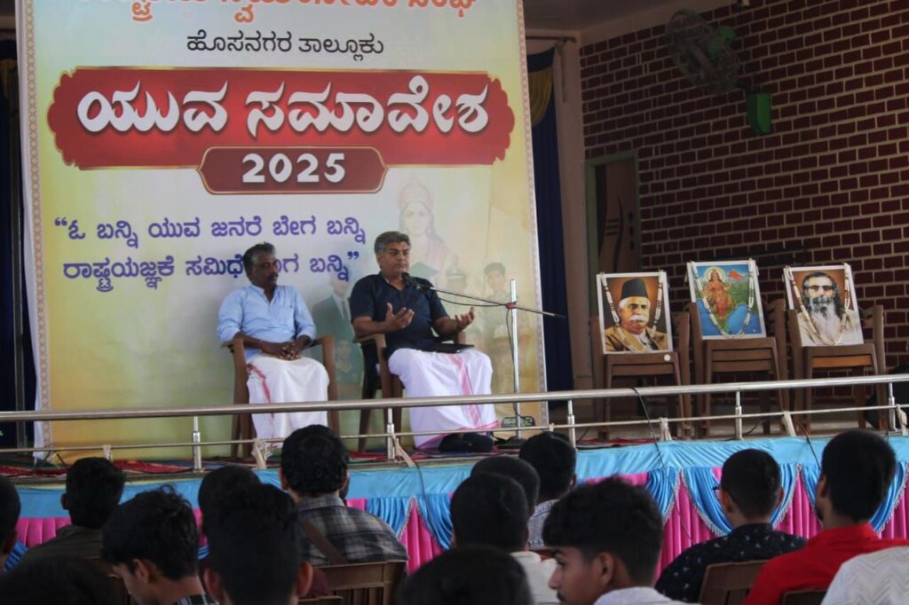 ರಿಪ್ಪನ್ ಪೇಟೆ: ರಾಷ್ಟ್ರೀಯ ಸ್ವಯಂಸೇವಕ ಸಂಘದ ಶತಾಬ್ದಿ ವರ್ಷದ ನಿಮಿತ್ತ ಯುವ ಸಮಾವೇಶವನ್ನು ಪಟ್ಟಣದ ವಿಶ್ವಮಾನವ ಸಭಾ ಭವನದಲ್ಲಿ ನಡೆಯಿತು.ಹೊಸನಗರ ತಾಲೂಕಿನ 18-28 ವಯಸ್ಸಿನ ಯುವಕರು ನೂರಾರು ಸಂಖ್ಯೆಯಲ್ಲಿ ಭಾಗಿಯಾಗಿದ್ದರು. ಕಾರ್ಯಕ್ರಮದ ಉದ್ಘಾಟನೆಯನ್ನು ಆರೆಸೆಸ್ಸ್ ನ ತಾಲೂಕು ಸಂಘಚಾಲಕರಾದ ಶ್ರೀ ಶ್ಯಾಮ್ ಸುಂದರ್ ಅವರು ನೆರವೇರಿಸಿದರು. ಕಾರ್ಯಕ್ರಮದ ಪ್ರಾರಂಭದಲ್ಲಿ ಆರೆಸೆಸ್ಸ್ ಪರಿಚಯ ಮಾಡಲಾಯಿತು. ಗಣೇಶ ಮಧುಕರ್ ಅವರು ಸಾಂಸ್ಕೃತಿಕ ಭಾರತದ ಭೂಪಟ ಪರಿಚಯ ಮಾಡಿಕೊಟ್ಟರು. ಮೊರನೇ ಅವಧಿಯಲ್ಲಿ ಕೃಷಿ ,ವಿಜ್ಞಾನ,ರಾಮಾಯಣ,ಮಹಾಭಾರತ,ಪರಿಸರ ಹೀಗೆ ಎಲ್ಲಾ ಕ್ಷೇತ್ರದ ವಿಷಯಗಳ ಮೇಲೆ ರಸಪ್ರಶ್ನೆ ಕಾರ್ಯಕ್ರಮವನ್ನು ನಂದನ್ ನಡೆಸಿಕೊಟ್ಟರು.