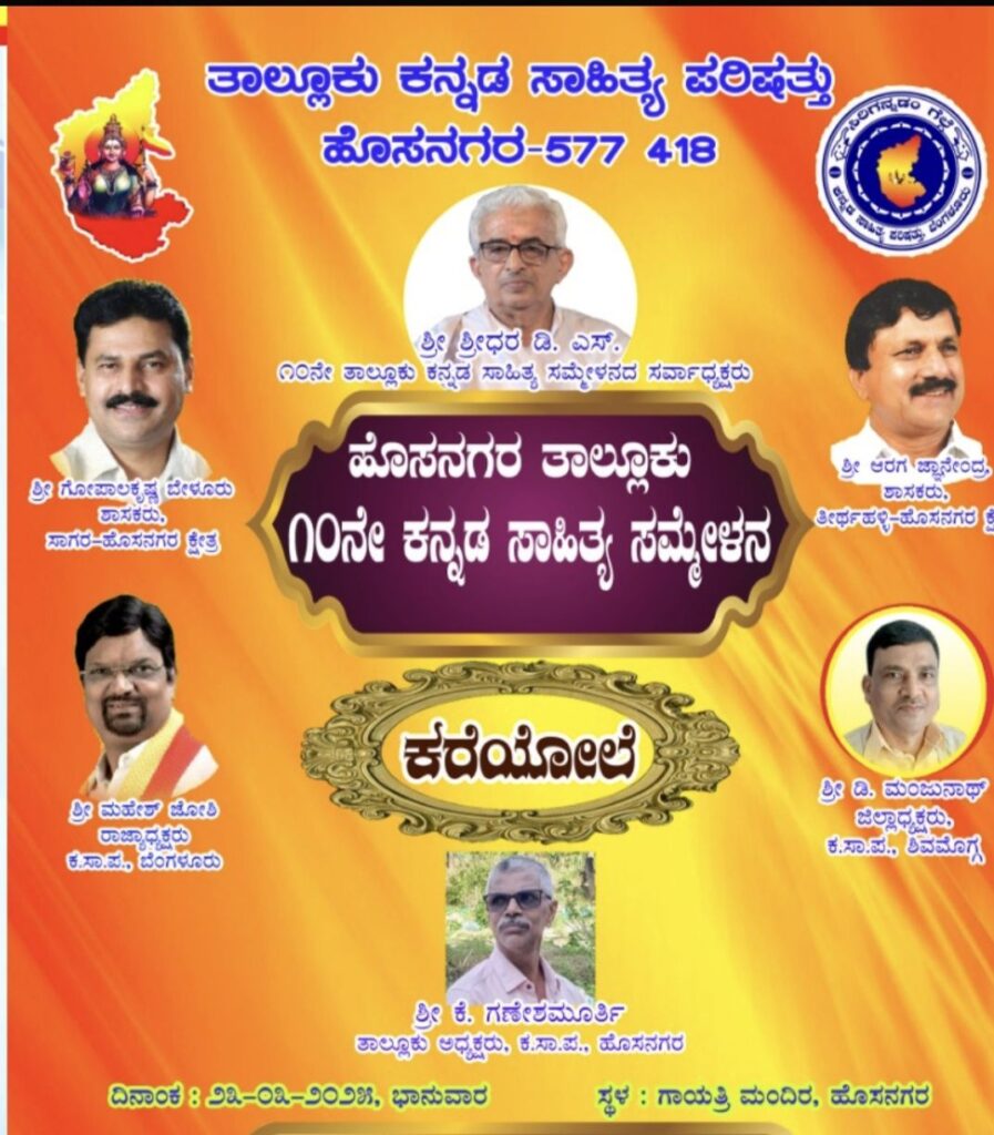 ಹೊಸನಗರ: ತಾಲೂಕು ಹತ್ತನೇ ಕನ್ನಡ ಸಾಹಿತ್ಯ ಸಮ್ಮೇಳನ ನಾಳೆ ಗಾಯತ್ರಿ ಮಂದಿರದಲ್ಲಿ ನಡೆಯಲಿದ್ದು ಈ ಬಾರಿಯ ಸಮ್ಮೇಳನದ ಸರ್ವಾಧ್ಯಕ್ಷರಾಗಿ ಯಕ್ಷಗಾನ ಅಕಾಡೆಮಿ ಸದಸ್ಯ, ಖ್ಯಾತ ಯಕ್ಷಗಾನ ಅರ್ಥದಾರಿ, ಪ್ರಸಂಗ ಕರ್ತೃ, ಕಾದಂಬರಿಕಾರ ಮೂಲತಃ ಹೊಸನಗರ ತಾಲೂಕಿನ ನಿಟ್ಟೂರು ಸಮೀಪದ ದರೇಮನೆ ಡಿ ಎಸ್ ಶ್ರೀಧರ್ ಅವರು ವಹಿಸಲಿದ್ದು